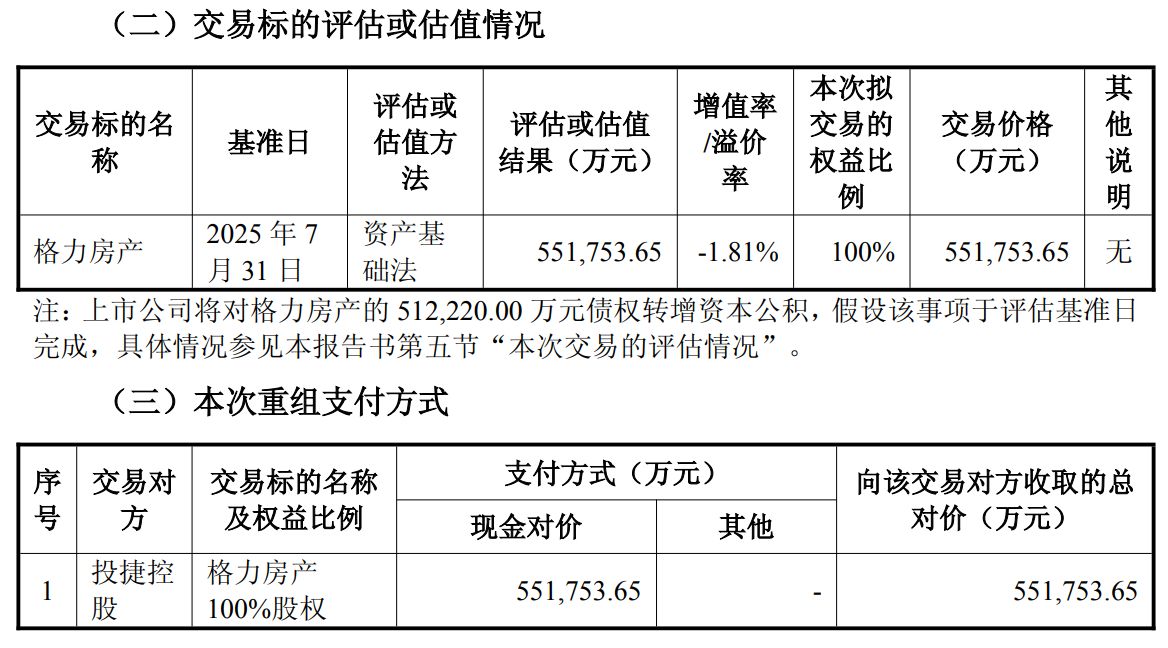 回看出售格力房產這筆交易,草案顯示,該交易擬采用資產基礎法進行估值,估值結果為55.18億元,減值率 1.81%。其中,存貨評估減值8570.16萬元,減值率1.65%;長期股權投資評估減值1970.31萬元,減值率1.87%。