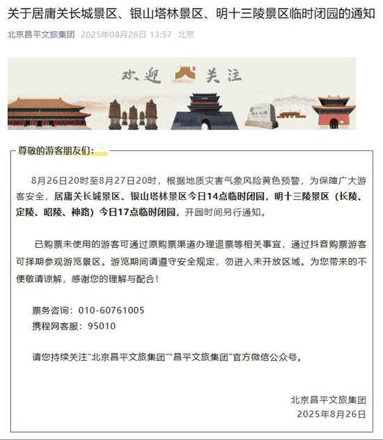 根據(jù)氣象部門(mén)天氣預(yù)警信號(hào),暴雨預(yù)警8月26日,北京北京香山公園、公園關(guān)閉國(guó)家植物園、景區(qū)玉淵潭公園、暴雨預(yù)警慕田峪長(zhǎng)城等多家公園景區(qū)臨時(shí)關(guān)閉。北京