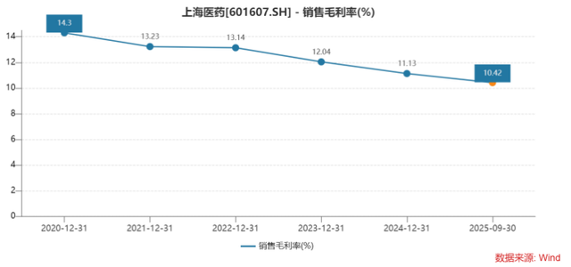 Wind數據顯示,2020年—2024年,以及2025年前三季度末,這家公司的銷售毛利分別為14.3%、13.23%、13.14%、12.04%、11.13%、10.42%。