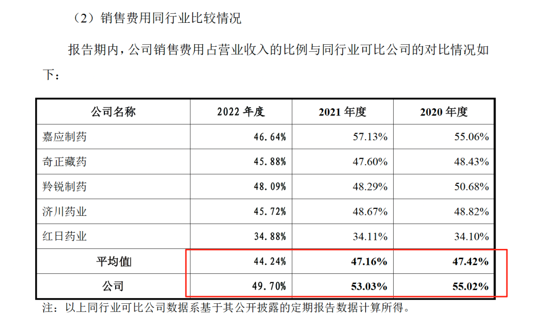 2020年至2022年,百神藥業(yè)的銷售費(fèi)用分別為3.03億元、3.32億元、2.80億元,三年花了超9億元在銷售費(fèi)用上,占營業(yè)收入的比例分別為55.02%、53.03%和49.7%,高于平均值。