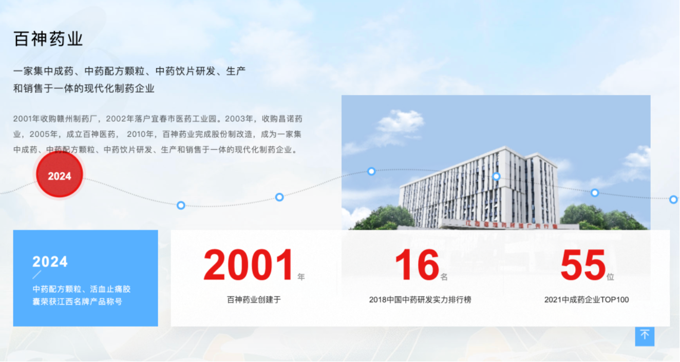 官網(wǎng)顯示,江西百神藥業(yè)股份有限公司創(chuàng)建于2002年,是一家集中成藥、中藥配方顆粒、中藥飲片研發(fā)、生產(chǎn)和銷售于一體的現(xiàn)代化制藥企業(yè)。
