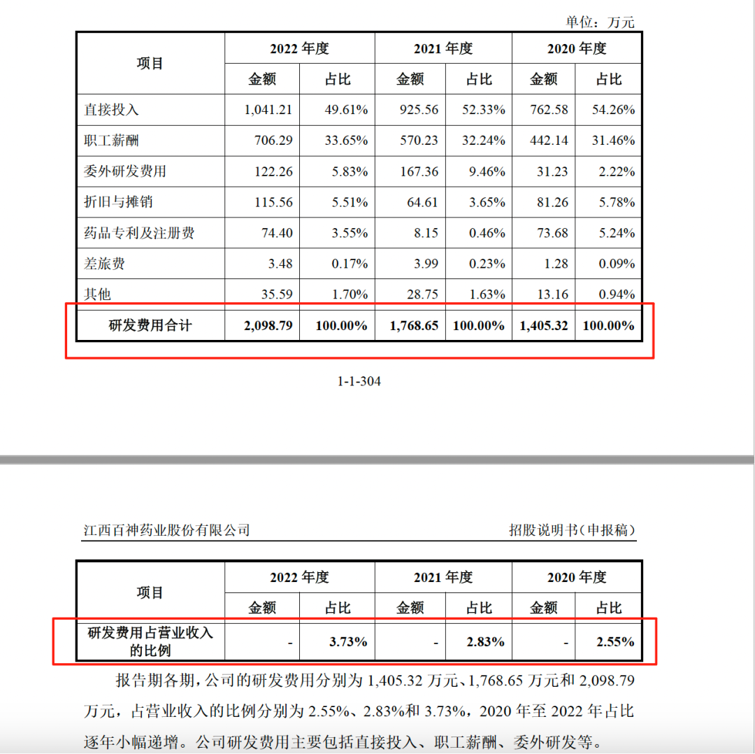 而作為一家研發(fā)創(chuàng)新藥品的高新技術(shù)企業(yè),百神藥業(yè)的研發(fā)費(fèi)用遠(yuǎn)低于銷售費(fèi)用。報(bào)告期各期,公司研發(fā)費(fèi)用分別為0.14億元、0.18億元和0.21億元,占營收比例2.55%、2.83%和3.73%,累計(jì)研發(fā)費(fèi)用為0.53億元。