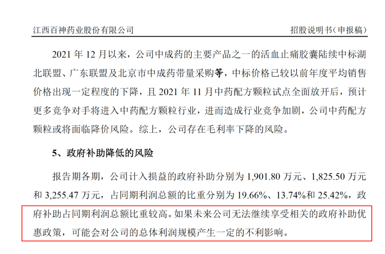 百神藥業(yè)在招股書中提到,如果未來公司無法繼續(xù)享受相關(guān)的政府補(bǔ)助優(yōu)惠政策,可能會對公司的總體利潤規(guī)模產(chǎn)生一定的不利影響。