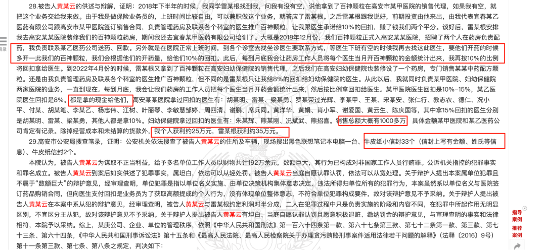 值得注意的是,所有回扣均為現(xiàn)金支付,并且用信封裝好交付給醫(yī)生。兩家醫(yī)院涉及的醫(yī)生超過30個(gè),藥品銷售總額超1000萬,黃某云個(gè)人獲利約25萬元,雷某根獲利約35萬元。