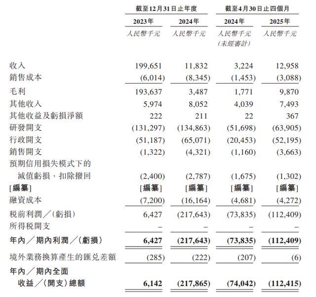 雖然已經有兩款商業化產品,但旺山旺水還處于虧損狀態。具體來看,2023年和2024年收入分別為2億元、1183.2萬元,2025年前四個月收入1295.8萬元。2023年、2024年、2025年前四個月公司凈利潤分別為6427萬元、-2.18億元和-1.12億元。此外,公司期末現金及現金等價物分別為9597.4萬元、1.21億元和7283.3萬元。